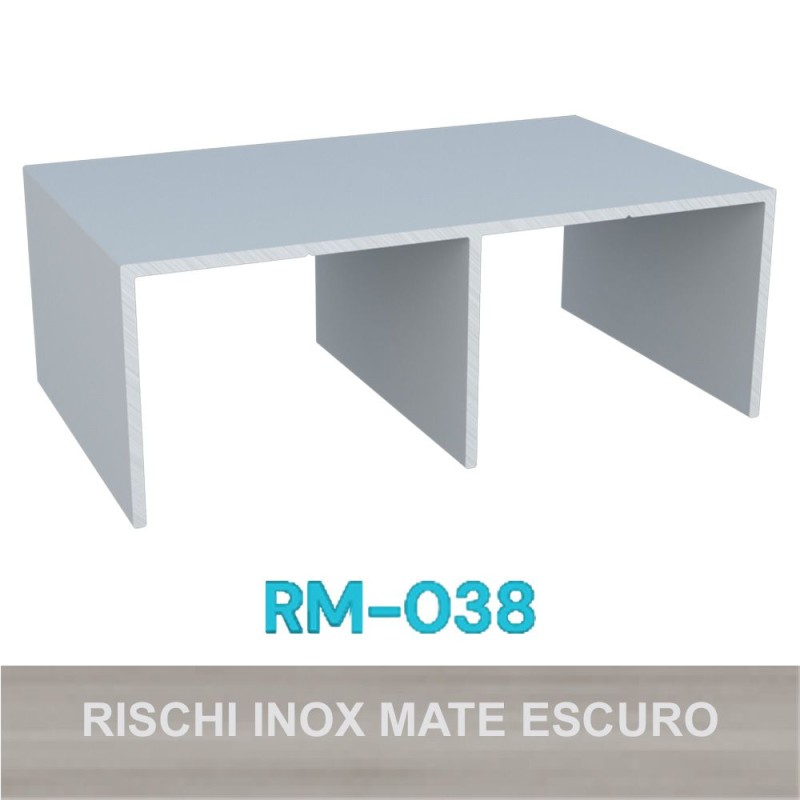 Trilho Duplo sobreposto para composição com sistemas padrão. O Trilho Superior RM-038, para sistemas deslizantes com sustentação na base, é fabricado em alumínio e seu acabamento é anodizado. Ele é compatível com os sistemas deslizantes da Rometal
