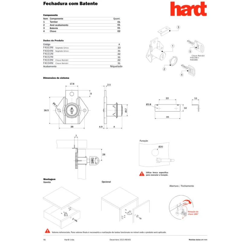 FECHADURA PARA GAVETA HARDT F4003NI CURTA SEGREDO ÚNICO 22MM