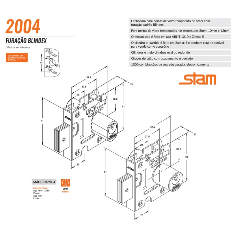 A fechadura 2004 da Stam é indicada para portas de vidro de giro/bater com furação Blindex.