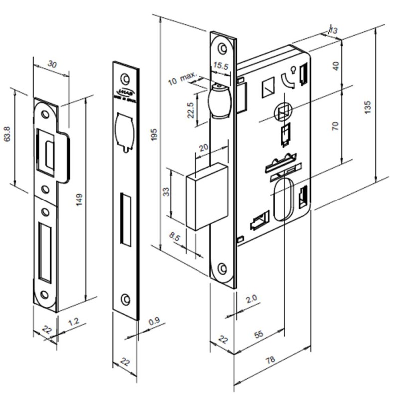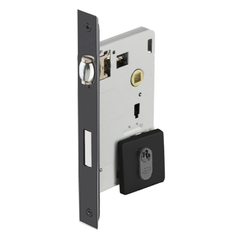 FECHADURA DE EMBUTIR 1710 PARA PORTAS DE BATER E PIVOTANTES EM MADEIRA OU METÁLICAS. ATENDEM À NORMA ABNT NBR 14913 TIPO IV, COM DISTÂNCIA DE BROCA DE 55 MM E DISTÂNCIA ENTRE OS EIXOS DA MAÇANETA E CILINDRO DE 70 MM, COM FALSATESTA EM AÇO INOX DE 195 X 22 MM, COM CANTOS RETOS OU ARREDONDADOS. AS FECHADURAS IMAB 1710 TÊM ESTRUTURAS REFORÇADAS E CHAPAS EM AÇO ZINCADO, COM COMPONENTES SUPERDIMENSIONADOS, TRATADOS INDIVIDUALMENTE CONTRA A CORROSÃO. O CUBO DE MAÇANETA TEM MOLA REFORÇADA E SISTEMA ANTIDESGASTE. O TRINCO ROLETE EM LATÃO TEM SISTEMA SIMPLIFICADO DE REVERSÃO, COM RECOLHIMENTO ATRAVÉS DA CHAVE E SISTEMA DE REGULAGEM DA POSIÇÃO VIA PARAFUSO NA PARTE FRONTAL, COM ACESSO DISPONÍVEL TAMBÉM APÓS A INSTALAÇÃO. A LINGUETA EM ZAMAK APRESENTA SISTEMA DE ACIONAMENTO COMPATÍVEL COM CILINDROS COMPACTOS IMAB 3000, 2500 E 3800. O SISTEMA DE DESBLOQUEIO DA CHAVE FUNCIONA MESMO COM OUTRA INSERIDA NO LADO OPOSTO. A FALSATESTA, A CONTRATESTA E OS PARAFUSOS DE FIXAÇÃO, FORNECIDOS EM CONJUNTO, SÃO DE AÇO INOX 304. O CILINDRO DE SEGURANÇA IMAB 3000, COMPACTO DUPLO MONOBLOCO, É PRODUZIDO EM LATÃO MACIÇO, COM 5 PINOS E CONTRAPINOS EM LATÃO, MOLAS EM AÇO INOX. SEGREDOS COM TECNOLOGIA IMAB, COM DENTES E CÓDIGOS GERADOS POR COMPUTADOR. CHAVES EM LATÃO NIQUELADAS E CAME DUPLO.