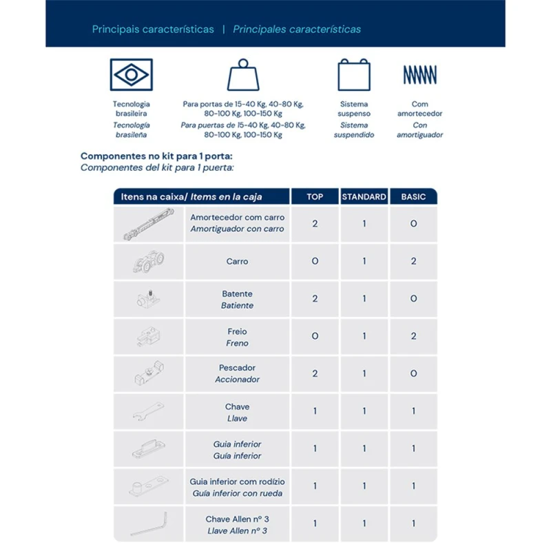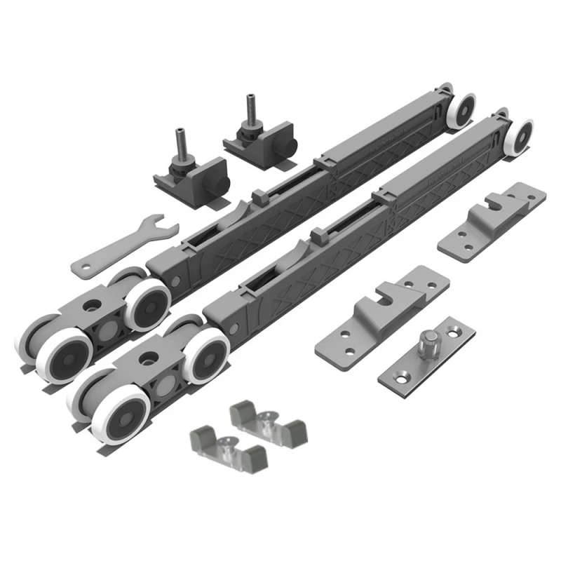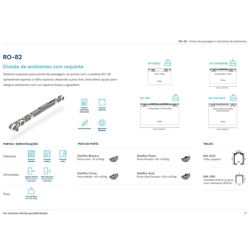 O sistema RO-82 é um sistema suspenso para portas de passagem. As portas, com este sistema, apresentam apenas o trilho superior, deixando o piso livre. Uma ótima opção para integrar ambientes com um aspecto limpo e agradável. Sistema muito utilizado em divisórias de ambientes e closets, por proporcionar um deslizamento mais suave e silencioso, evitando batidas, devido a seu sistema de amortecimento. O sistema RO-82 Top possui 2 amortecedores.