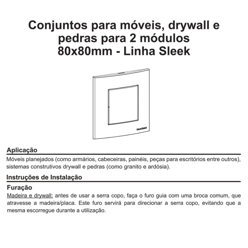 Os conjuntos para móveis da Linha Sleek Margirius 80x80mm são ideais para aplicação em peças planejadas, drywall e também em pedras. Permitem a montagem em furos com 70mm de diâmetro e são compatíveis com 2 módulos simples ou 1 módulo duplo. Acompanham os parafusos de fixação.