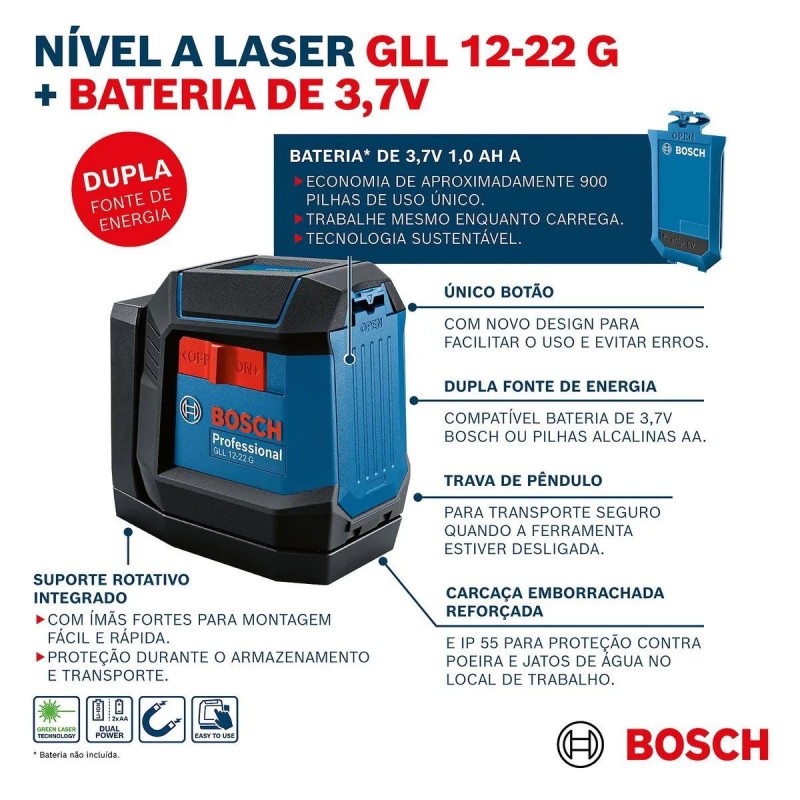 O nível de linhas BOSCH GLL 2-12 é uma ferramenta simples e compacta para múltiplos trabalhos no interior. Ele cria linhas cruzadas para alinhamento horizontal e vertical, possui um interruptor único facilitando assim o processo de ligar e desligar.