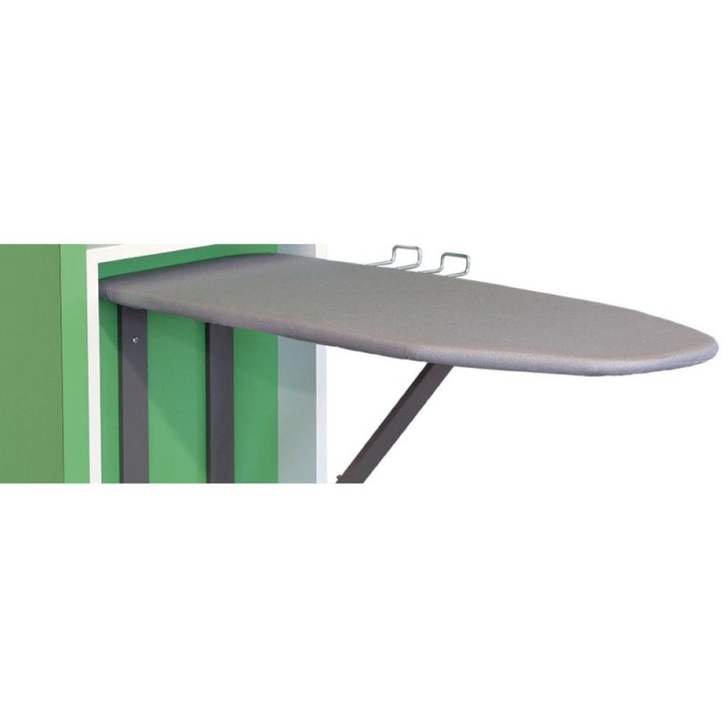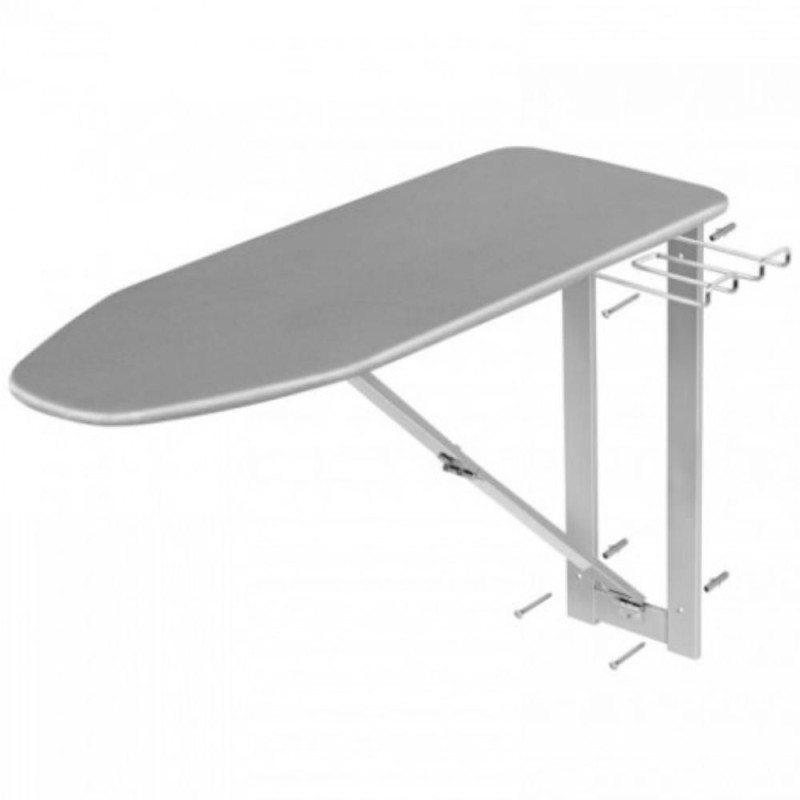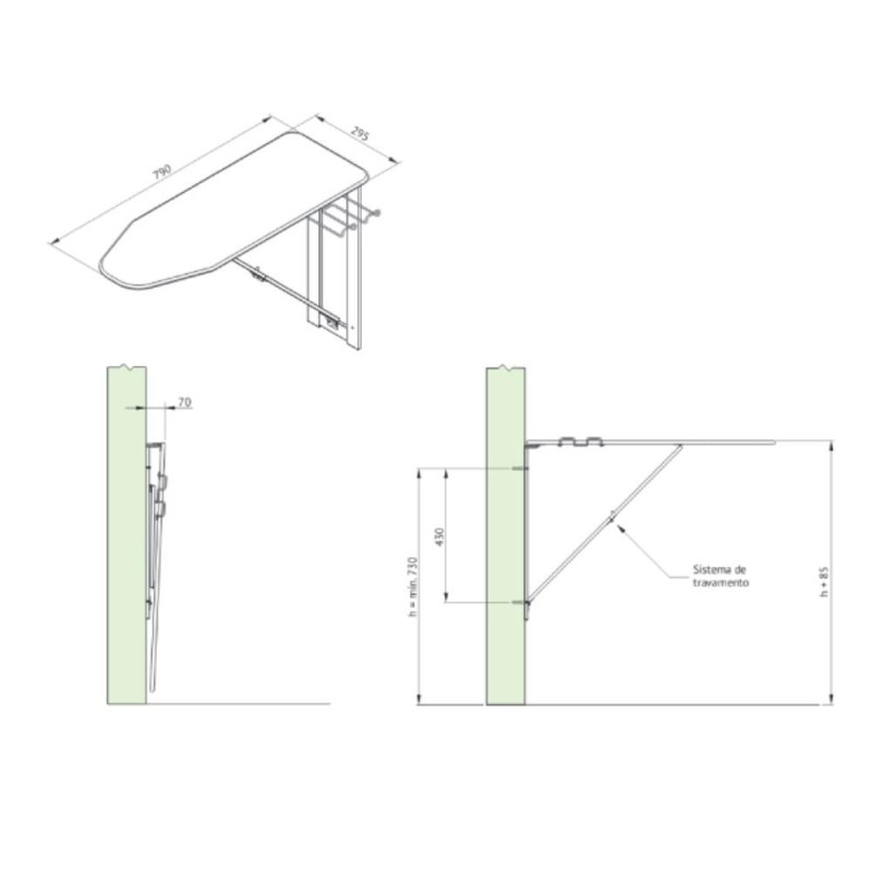 TÁBUA DE PASSAR ARTICULADA com fixação vertical, que não ocupa espaço quando fechada. Estrutura tubular articulada e tampo em compensado multilaminado. Forro térmico em tecido aluminizado.